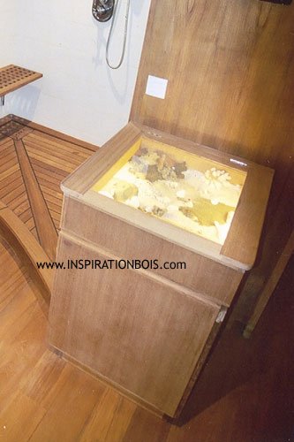 Habillage de la fenêtre oscillo-battante en Teck massifQu'il s'agisse de l'agencement complet en bois d'une salle de bain ou d'un espace spa, ou plus simplement d'un élément mobilier seul, nous associons esthétique et technique dans la réalisation de chaque projet.